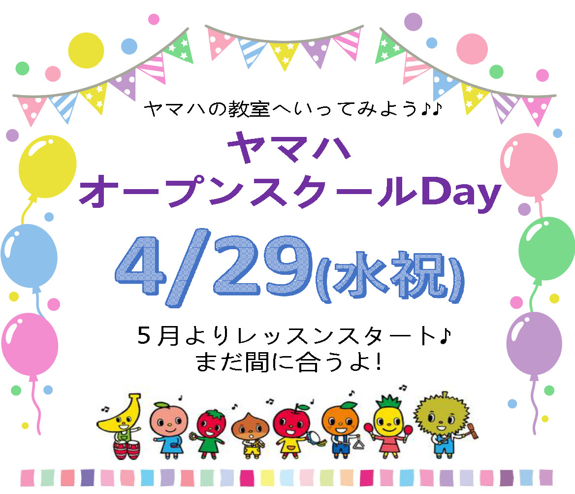 2026年3月31日 静岡草薙センターお知らせ イベント情報4/29(水祝)『ヤマハオープンスクールDAY』お申込み受付中♪ヤマハ音楽教室&英語教室のオープンスクール(体験レッスン)DAY!!5月からの新開講、また間に合うよ^^☆