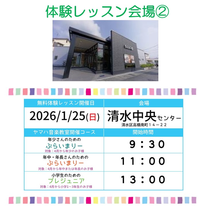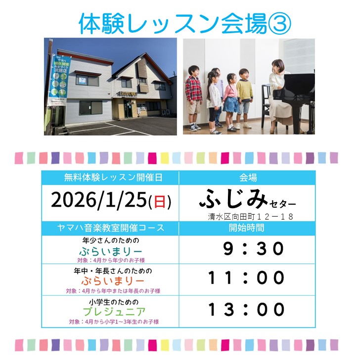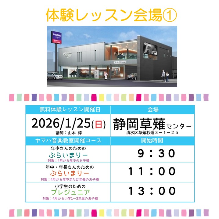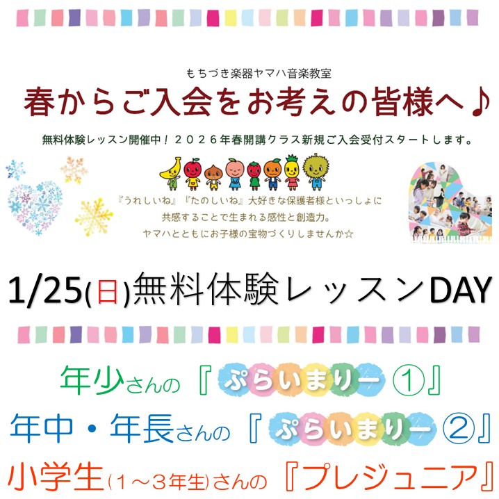 1/25(日)ヤマハ無料体験レッスンDAY♪2026年度春組入会受付スタート!! 2026年1月6日 ヤマハ音楽教室【2026年春組】の無料体験レッスンが本格始動!! 皆様のご参加、是非お待ちしております♪ ●来春対象「年少さん」のための『ぷらいまりーコース』 ●来春対象「年中・年長さん」のための『ぷらいまりーコース』 ●来春対象「小学1~3年生さん」のための『プレジュニア』 2026/1/25(日)に市内3会場 『静岡草薙センター』『清水中央センター』『ふじみセンター』にて 無料体験レッスンを開催します!! ☆お申し込みはコチラから☆ ※他日程もコチラでご確認いただけます。 体験レッスンは、ご参加無料です ! 皆様のご参加を、心よりお待ちしております!! 【お問合せ】もちづき楽器 ● 静岡草薙センター TEL 054-368-6212 ● 清水中央センター TEL 054-364-8166 ● ふじみセンター TEL 054-353-2314(巴町本店TEL)